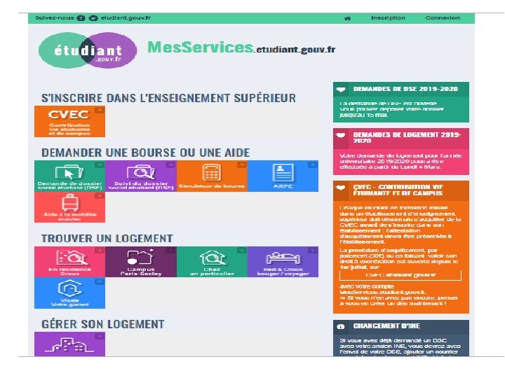 Vie étudiante Un calendrier articulé avec Parcoursup : • Bourse et logement Entre le 1 janvier 5 et le 15 mai • Créer son dossier social étudiant (DSE) sur www. messervices. etudiant. gouv. fr pour demander une bourse et/ou un logement • Les demandes de logement en résidence universitaire peuvent être effectuées jusqu’à la rentrée en septembre • Santé • Les étudiants sont automatiquement affiliés au régime général de la Sécurité Sociale. Il n’ont aucune démarche à faire.