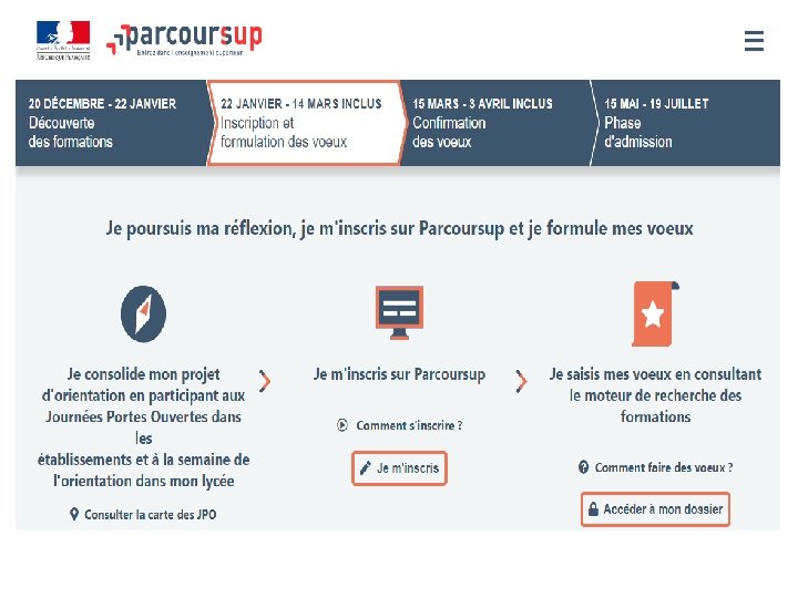 Du 22 janvier au 14 mars 23 h 59 Vous aurez besoin de : Ø Date de naissance Ø INE 10 chiffres + 1 lettre ou 2 indiqué sur tous les bulletins Ø Numéro d’inscription au bac Ø Une adresse mail consultée régulièrement Ø Relevé des notes anticipées (STI 2 D/ST 2 S/STL/ES/S) Ø un numéro de téléphone Il est recommandé d’y inscrire celui des parents. ØLa rubrique ma préférence doit être remplie avant de pouvoir saisir des vœux Ø Le projet de formation motivé est à remplir soigneusement pour chaque formation demandée