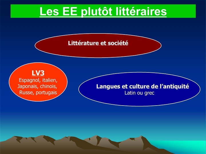 1 économie + Au choix EE Littéraires Création et activités artistiques Grec ou Latin Littérature et LV 3 Société