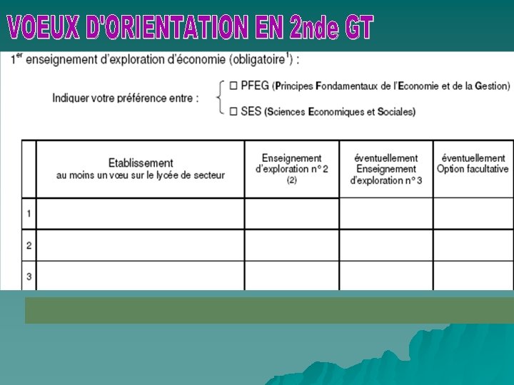 3ème trimestre Phase de vœux définitifs vœux à formuler au mois de mai sur la fiche de dialogue Préciser quelle seconde et quel établissement Décision du conseil de classe pour le passage en 2 nde GT