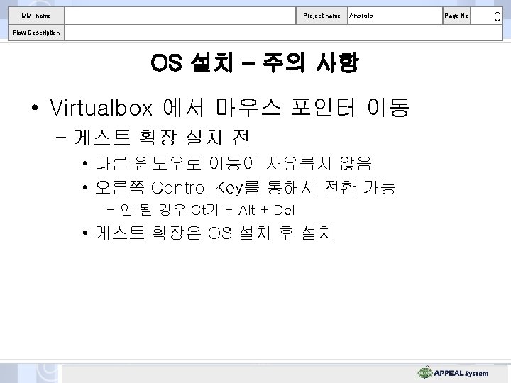 MMI name Project name Android Flow Description 준비 작업 • Virtualbox – Free, Opensource • VMWare : 상용 프로그램 – Virtual. Box-3. 1. 6 -59338 -Win 사용 – http: //www. virtualbox. org/ Page No 0