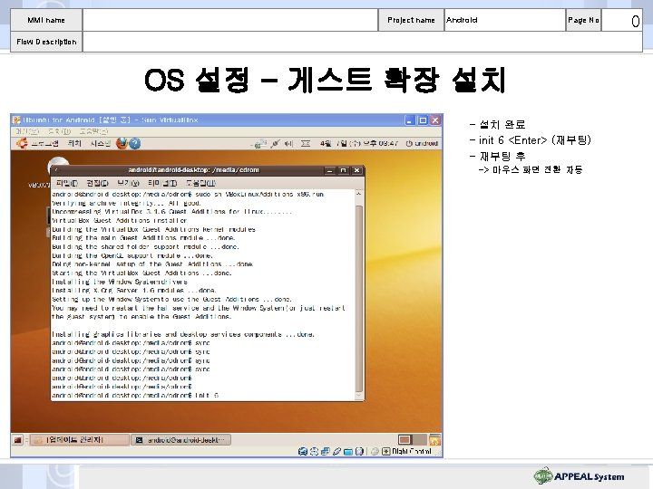 MMI name Project name Android Page No 0 Flow Description OS 설정 – 게스트 확장 설치 - cd /media/cdrom <Enter> - sudo sh VBox. Linux. Additions-x 86. run <Enter>