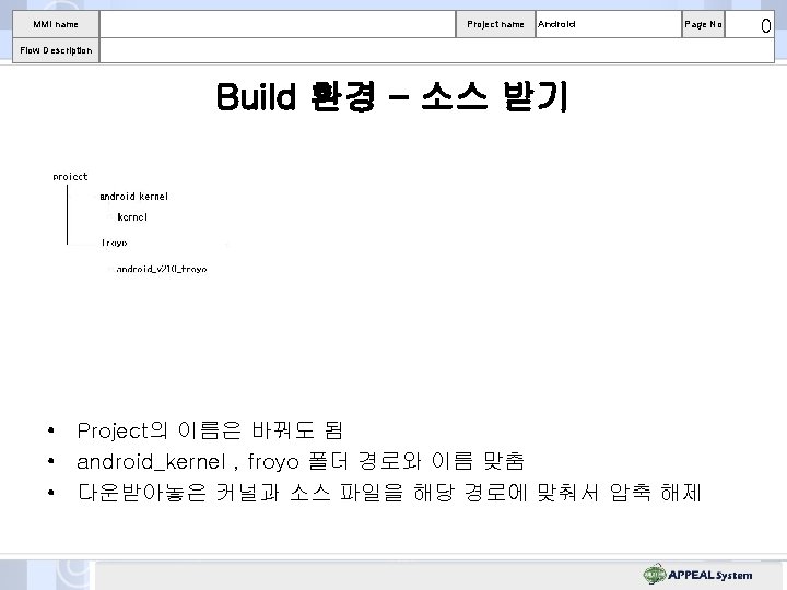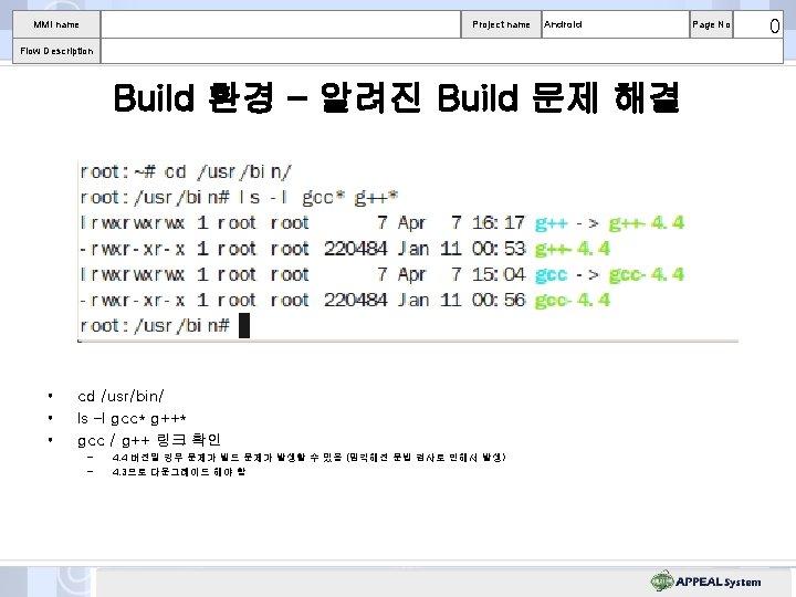 MMI name Project name Android Flow Description Build 환경 – 알려진 Build 문제 해결 • • • 주의! sudo /usr/bin 에서 작업 할 것(cd /usr/bin) mv g++. org mv gcc. org ln –s g++-4. 3 g++ ln –s gcc-4. 3 gcc Page No 0