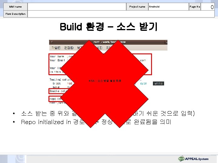 MMI name Project name Android Page No Flow Description Build 환경 – 소스 받기 repo init -u git: //android. git. kernel. org/platform/manifest. git -b eclair NSA : : 소스 받을 필요 없음 • 주의 !! 위 명령은 소스 받을 폴더 안에서 수행 할 것 ! 0