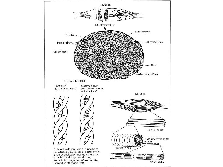 Kött • Kött ~ muskelvävnad – Egentlig muskel, den delen som kan kontraheras (aktin och myosin) – Bindväv (kollagen) – Mellanlagrat fett • Vita och röda muskler – – anaerob resp aerob metabolism, myoglobinmängd