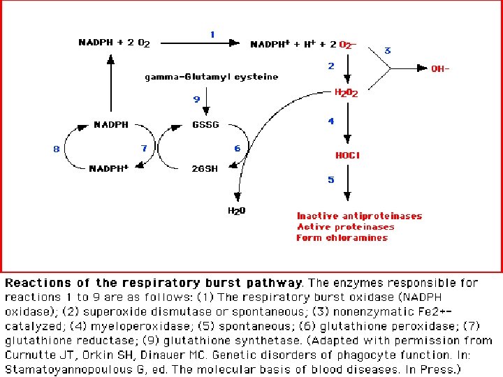 Lökositlerdeki Kalitatif Değişiklikler (mikrop öldürme fonksiyonunda bozulma) • Fagositlerdeki iki genetik eksiklik , klinik olarak önemlidir. Şiddetli , hatta çoğu zaman fatal infeksiyonlara yol açar: 1) Kronik granülomatöz hastalık (CGD): NADPH oksidaz enziminde defekt vardır, süperoksit anyonları ve hidrojen peroksit yapımında bozukluk vardır. M. org fagosit içinde öldürülemez. NBT boya testinde fagositler boyayı kullanamaz. Fagositik fonksiyon bozukluklarında bahsedildi.