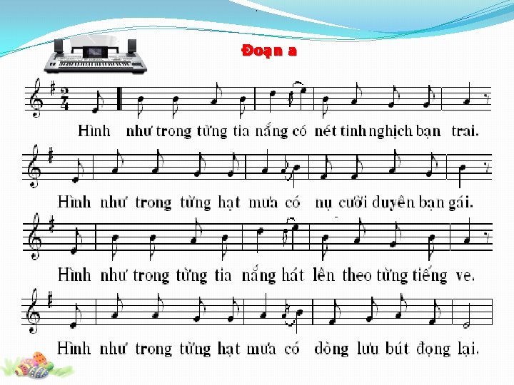 Haùt keát hôïp goõ theo nhòp 2 _ _ _ __ __ _ _ _ Hình nhö trong töøng tia naéng coù neùt tinh nghòch baïn trai. Hình nhö trong töøng haït möa coù nuï cöôøi duyeân baïn gaùi. Hình nhö trong töøng tia naéng haùt leân theo töøng tieáng ve. Hình nhö trong töøng haït möa coù doøng löu buùt ñoïng laïi. Tia naéng haït möa , tia naéng haït möa treû maõi maøu hoa phöôïng ñoû voâ tö. Baïn hôõi baïn ôi , ñöøng traùch ñöøng buoàn voâ côù laøm buoàn tia naéng haït möa. _ _