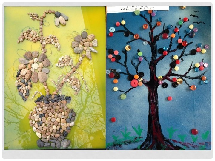 GV: TÓM TẮT • Có thể tạo hình sản phẩm mĩ thuậtdựa trên những vật liệu tìm được hoặc có ý tưởng rồi tìm vật liệu để tạo hình/ sắp đặt sản phẩm. • Cách thực hiện tạo hình sản phẩm: v Vẽ phác hình, nội dung muốn thể hiện. v Dùng keo dán để đính các chất liệu theo hình đã phác, tạo những hình ảnh chính. v Tạo những hình ảnh phụ, liên kết không gian với hình ảnh chính (hình ảnh phụ phù hợp với hình ảnh chính). v Trang trí thêm chi tiết bằng các chất liệu phụ hợp(có thể là màu, giấy màu, các chất liệu khác, …). v (Có thể thực hiện bằng cách lựa chọn vật liệu sẵn có sắp đặt tạo ra một sản phẩm mĩ thuật bất kì theo ý tưởng của cá nhân/nhóm).