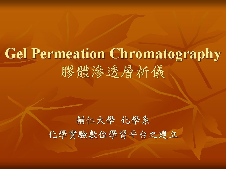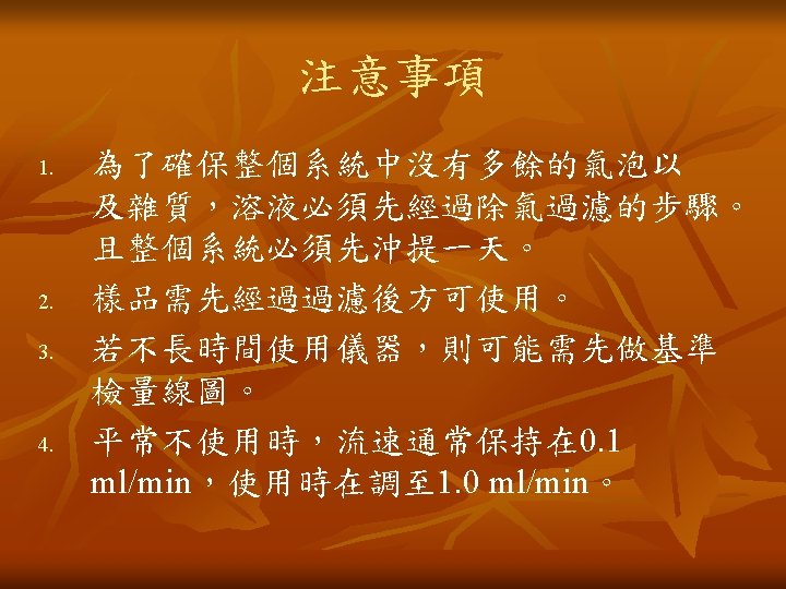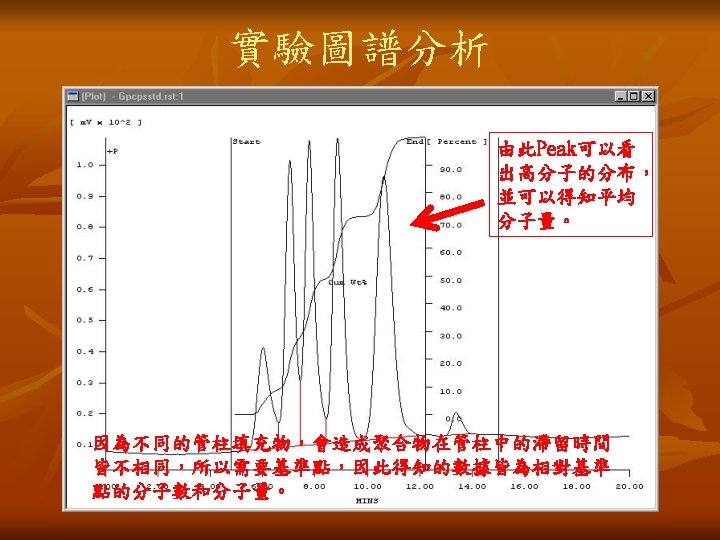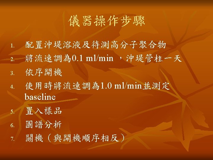 儀器操作步驟 n n n 由於GPC為相對莫耳重,所以儀器必須先校正( Calibration )。 公式 [η]為本質黏度(intrinsic viscosity) M為分子量(molecular weight) Φ為常數(universal constant) r 02 為均方根尾端與尾端距離 (root-mean-square end-to-end distance) 一般來說,以polystyrene為基準,分子量為 103~106, polydispersity約1. 15。
