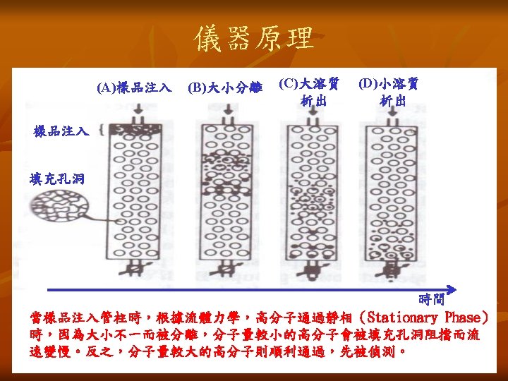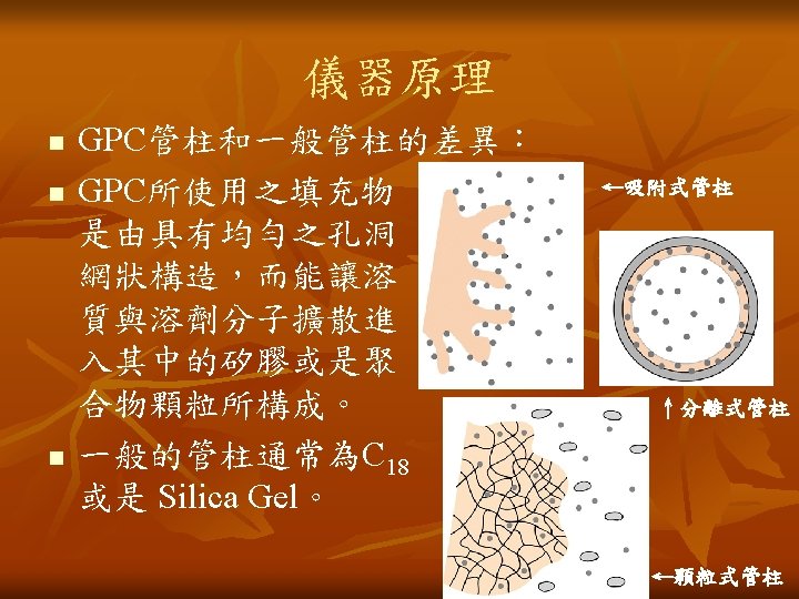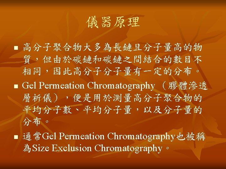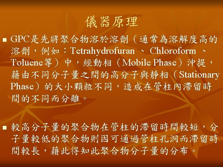 儀器原理 Mobile Phase (Solvent) 動相溶劑 GPC Columns GPC管柱 Injector 注射口 PUMP 加壓幫浦 Solvent Delivery System 溶劑沖提系統 Sample 樣品 Waste/Collect 廢液收集 Detector(s) 偵測器 Recorder 記錄器(電腦)