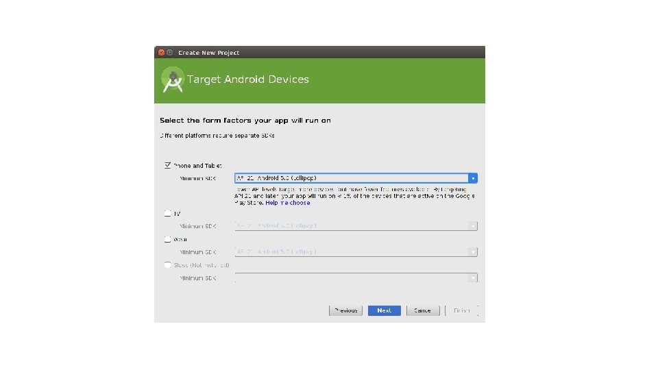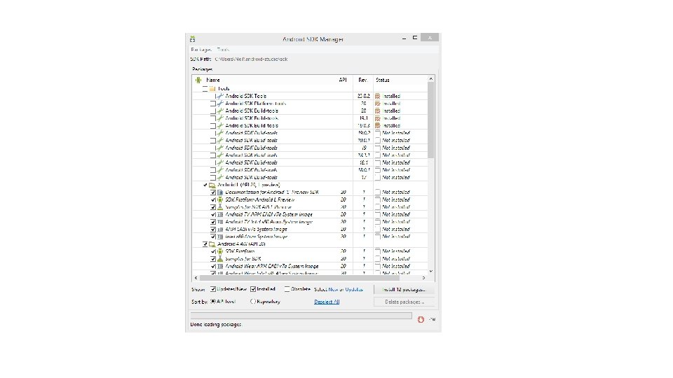 Installing the latest Android SDK package • By default only a set of packages are installed • Any missing or additional packages can be installed using the Android SDK Manager • Launched from Android Studio – Configure -> SDK Manager