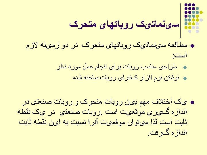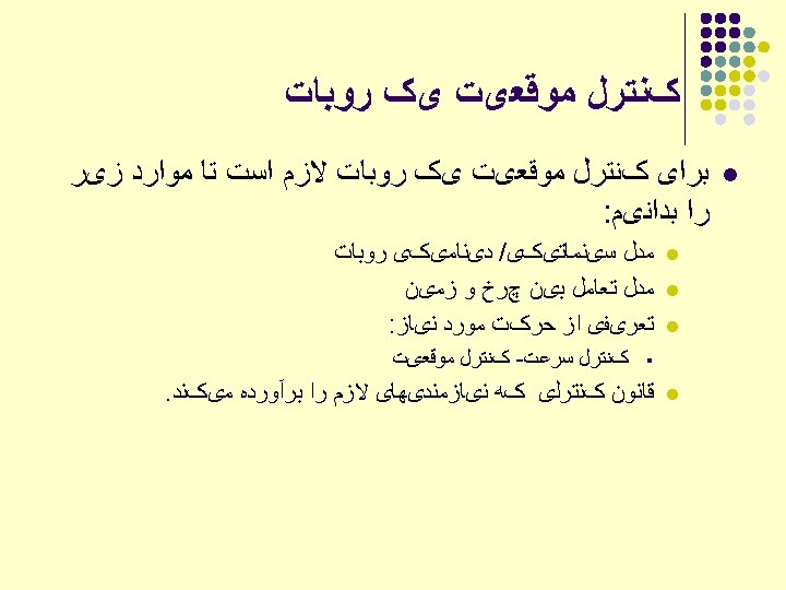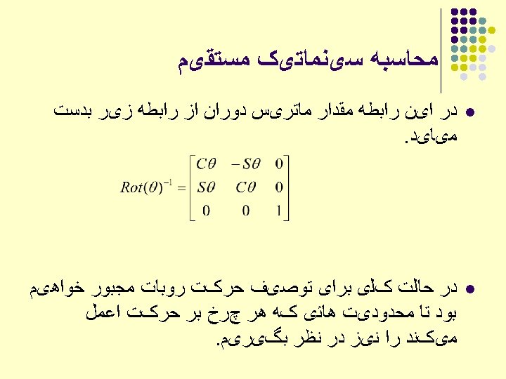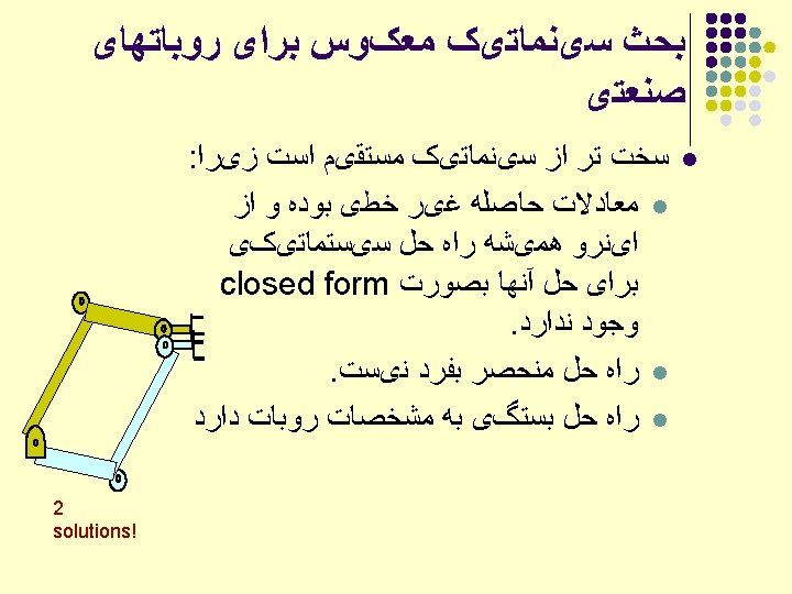 ﺑﺤﺚ ﺳیﻨﻤﺎﺗیک ﻣﻌکﻮﺱ ﺑﺮﺍی ﺭﻭﺑﺎﺗﻬﺎی ﺻﻨﻌﺘی Given a desired position (P) & orientation (R) of the endeffector Find the joint variables which can bring the robot the desired configuration
