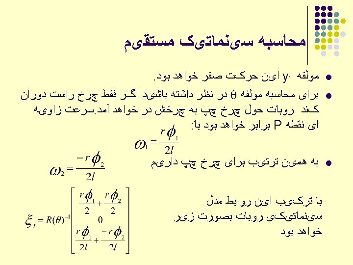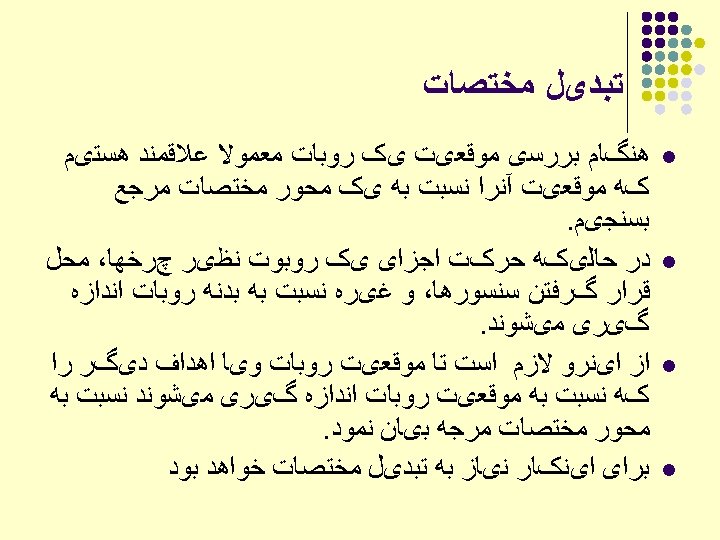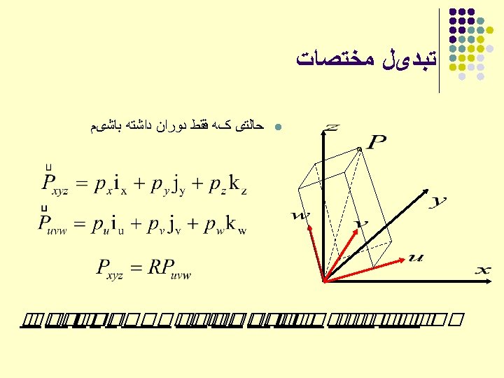 ﺗﺒﺪیﻞ ﻣﺨﺘﺼﺎﺕ l l Reference coordinate frame OXYZ Body-attached frame O’uvw Point represented in O’uvw: O, O’ Two frames coincide ==>