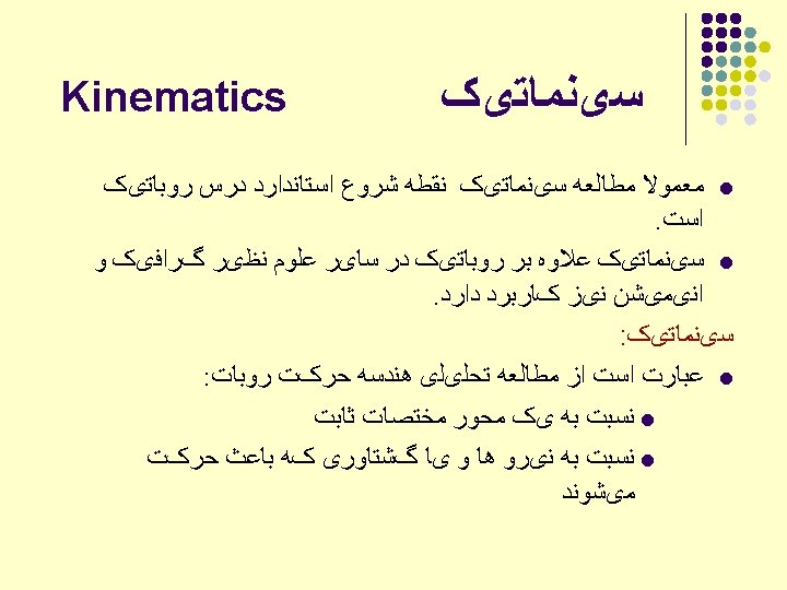 ﺑﺤﺚ ﺳیﻨﻤﺎﺗیک ﺑﺮﺍی ﺭﻭﺑﺎﺗﻬﺎی ﺻﻨﻌﺘی Forward kinematics Given joint variables End-effector position and orientation, -Formula?