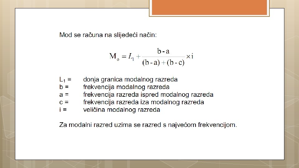 � Prilikom izračunavanja moda može se dogoditi da se najveća frekvencija nalazi na prvom ili posljednjem mjestu u nizu, u tom slučaju (ako je na prvom mjestu) nećemo imati vrijednost ispred modalnog razeda (a), tada umjesto nje stavljamo 0. � Ako je najveća vrijednost na posljednjem mjestu u nizu nećemo imati frekvenciju iza modalnog razreda (c) koju ćemo također označiti s 0.