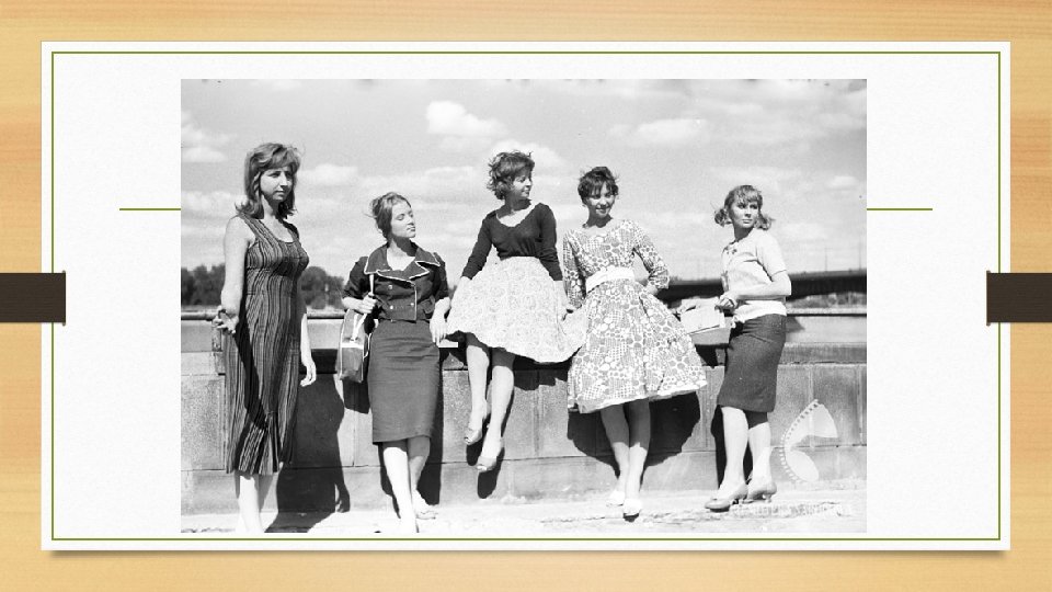 Lata 50 te • • W latach 50 tych popularne były sukienki z odkrytymi ramionami. Pod spódnice ubierano halki nadające im objętości. Talie podkreślano szerokim paskiem W połowie lat 50 tych Chanel wprowadziła torebki na łańcuszku, tym samym uwalniając kobiety od konieczności trzymania ich w rękach. • W dodatkach dominowały rękawiczki, klipsy i perły
