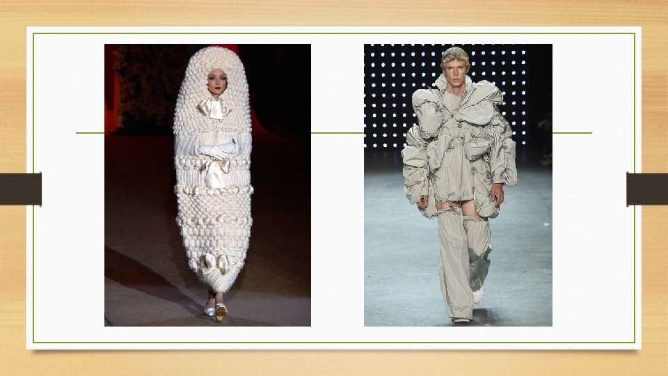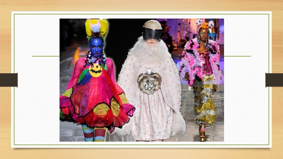 21 wiek • Moda 21 wieku to mieszanka wszystkich styli minionych lat. • Celem mody ma być wyrażanie samego siebie. • Dominują wszystkie długości, bogata kolorystyka oraz niecodzienne połączeni tkanin, wzorów oraz fasonów. • Moda często funkcjonuje jako dziedzina sztuki, a kreacje nie nadają się do użytku