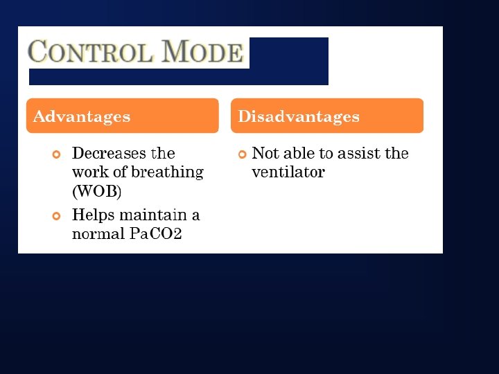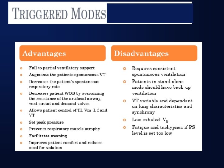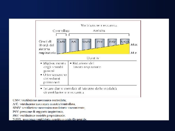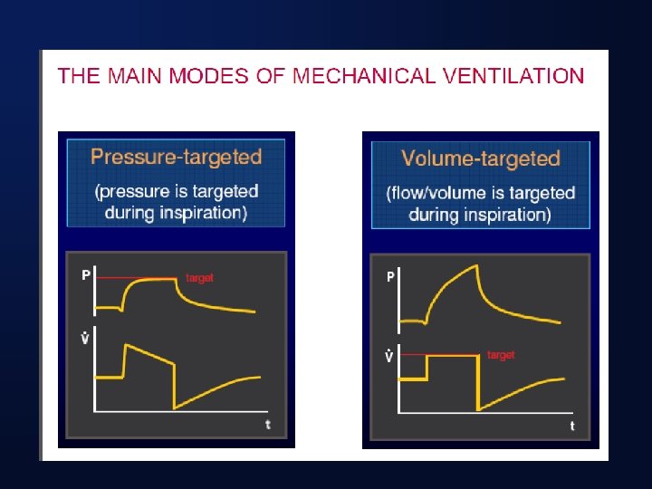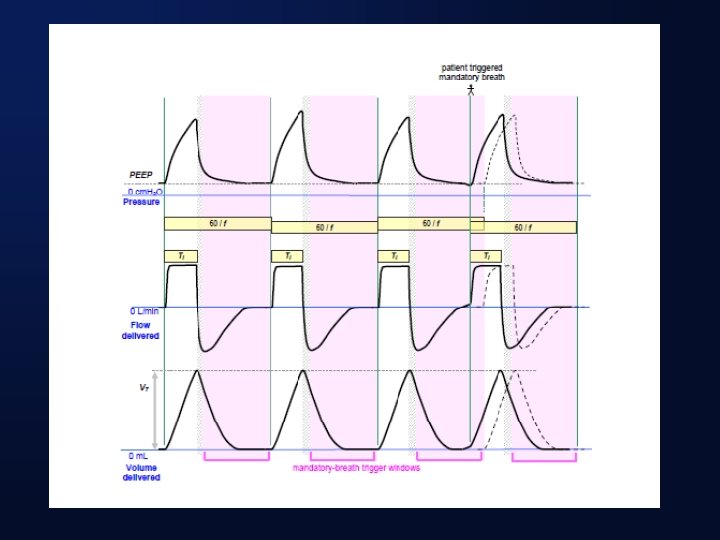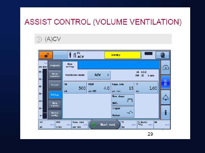 A-CV L’operatore imposta: -volume corrente -frequenza respiratoria -rapporto I/E -sensibilità del trigger -volume-controlled -time-cycled Caratteristiche: - volume corrente insufflato garantito - rapporto I/E variabile Problemi: - possibile sovrassistenza alcalosi respiratoria - insorgenza di PEEP intrinseca