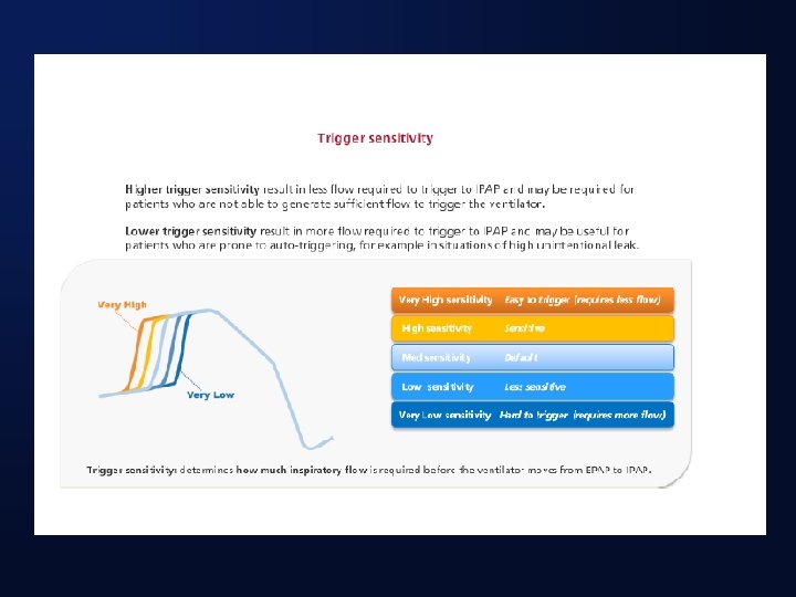 Ventilatore e perdite COMPENSAZIONE PERDITE: è la capacità di aggiungere flusso nel circuito per mantenere la pressione impostata; garantisce stabilità di pressione nel circuito. TOLLERANZA PERDITE: è la capacità di regolare la sensibilità del trigger in presenza di nuove perdite (nuova linea basale di flusso); il paziente non varia lo sforzo inspiratorio a causa di nuove perdite nel circuito