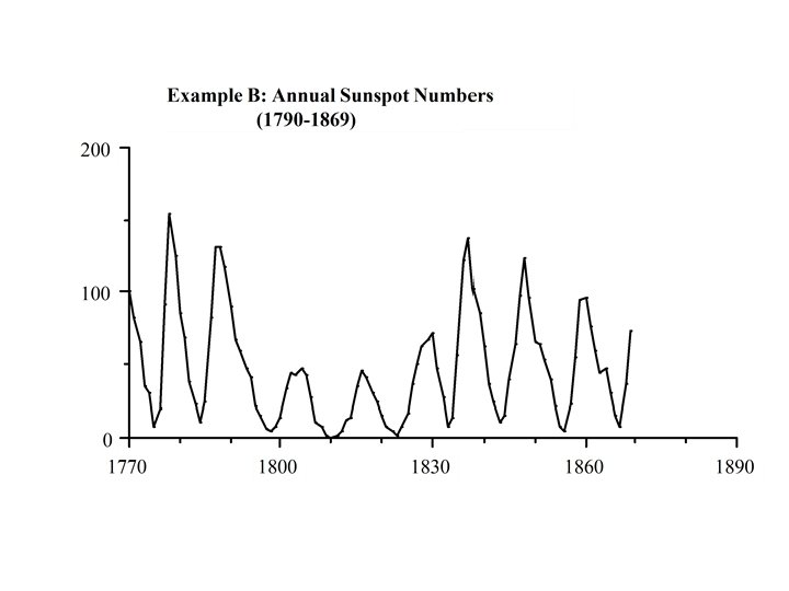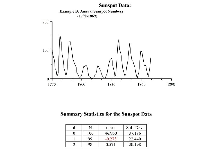 Example Considering the data in example 1 (Sunspot Data) the time series was identified as an AR(2) time series. The autocorrelation at lag 1 is r 1 = 0. 807 and the autocorrelation at lag 2 is r 2 = 0. 429. The equations for the estimators of the parameters of this series are which has solution Since d = m( 1 -b 1 - b 2) then it can be estimated as follows: