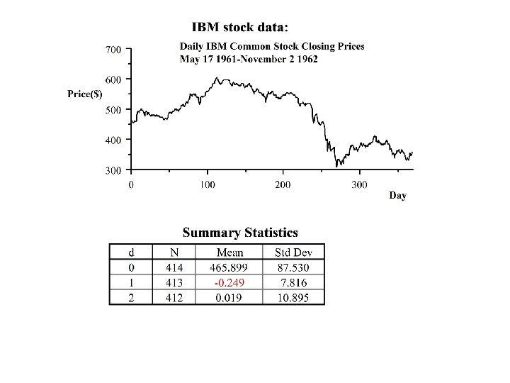 The estimate of the parameter m is the sample mean. Thus the identified model in this case is: Dxt = ut - 0. 53 ut-1 + 0. 002 or xt = xt-1 + ut - 0. 53 ut-1 + 0. 002 (An ARIMA(0, 1, 1) model) This compares with the other identification: xt = 0. 87 xt-1 + ut - 0. 48 ut-1 + 2. 25 (An ARIMA(1, 0, 1) model)
