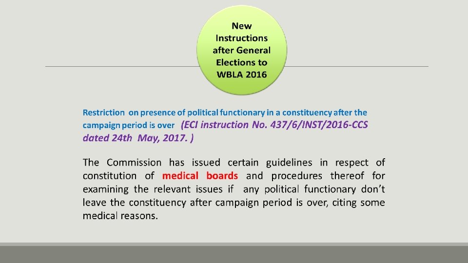 General/Bye Elections to the Lok Sabha/Legislative Assemblies- instructions on election campaigns. (ECI instruction No. 437/6/Campaign/ECI/INST/FUNCT/ MCC-2016 dated 4 th January, 2017) To maintain the election campaign in line with statutory provisions and to avoid clashes and conflicts between stakeholders i. e. political parties or their supporters and also to ensure peace and order during the campaign period, the Commission has reiterated the instructions in respect to the following issues ◦ ◦ ◦ ◦ ◦ Video-vans Use of Bike Road Shows Movement of vehicle during nomination Use of vehicle on poll day Use of Loudspeakers in processions and election meetings Use of flags Temporary Campaign Offices Single window system Use of space in Railway Stations, Bus Stands, Airports, Bridges-Railway and Roadways, Govt. Buses, Govt. and Public buildings, Electric and Telephone Poles, Municipal I local bodies' buildings, space and assets for political advertisement
