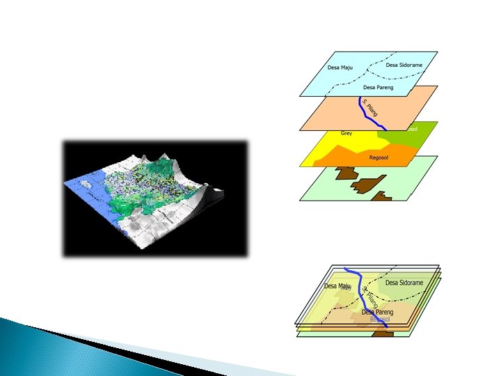 Jenis Layer � Layer or coverage = sekelompok data yang memiliki karakteristik khusus � Secara q umum ada 2 tipe dari layers: Layer raster: display image atau set data pixel dan image yang didisplay sering menghasilkan gabungan dari 2 atau lebih layers tipe raster (image RGB) Misal: Google Earth, foto, dll. q Layer vektor: mendisplay GIS dalam bentuk tabular (titik dan garis) dan data penyusun peta yang menutup data raster bila ditumpang tindihkan. Misal: Jalan, sungai, jenis tanah