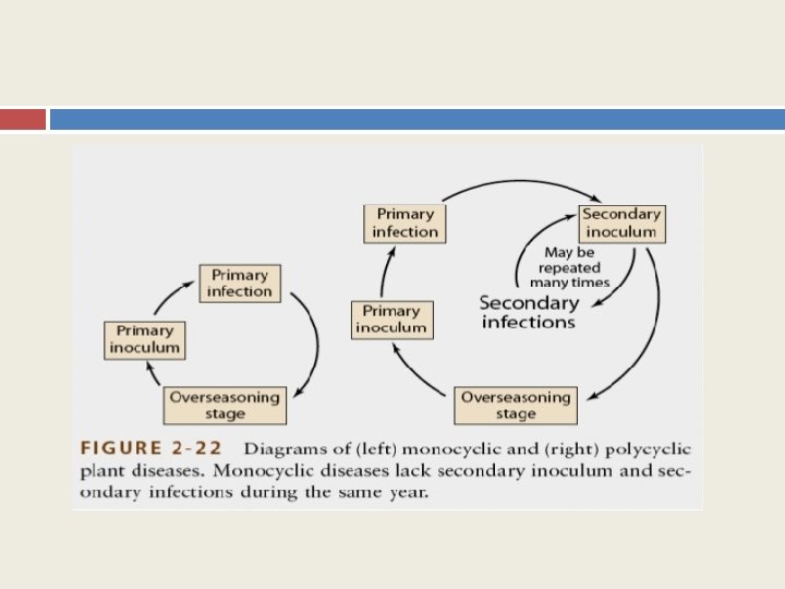 Penyakit Monosiklik ♣ Adalah : penyakit tumbuhan yang hanya menghasilkan satu generasi penyakit dalam satu musim tanam. Penyakit tipe ini berasal dari patogen dorman/bertahan, menghasilkan inokulum primer, menyebabkan infeksi primer, kemudian kembali memasuki fase dorman pada akhir musim