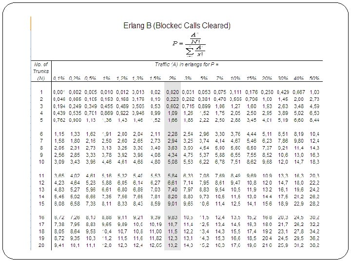 Cara membaca tabel erlang �Berapa trafik yang dapat ditawarkan, jika saluran yang disediakan N=8 dan probabilitas bloking 0. 02 ? �Dari tabel dapat dicari dengan menarik garis untuk N=8 dan Pb=0. 02, dari tabel didapatkan, traffik yg ditawarkan sebesar 3. 627 50