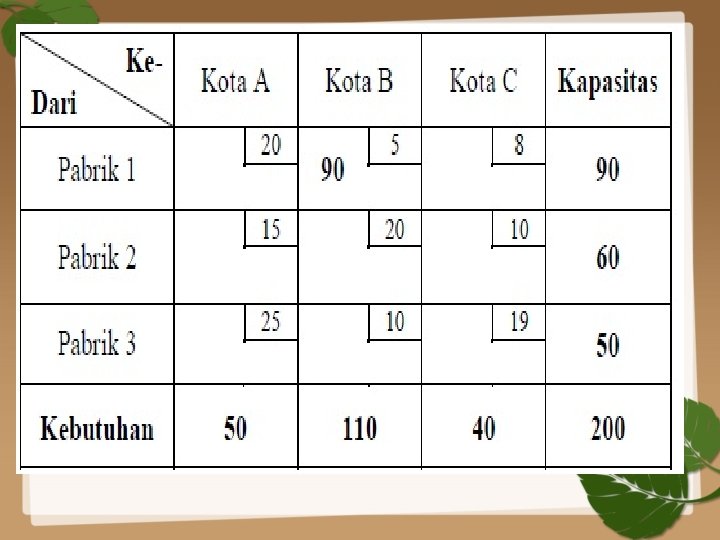 Dari tabel di atas dapat diketahui bahwa biaya transport total adalah sebagai berikut: Z = (3 x 80) + (5 x 70) + (6 x 50) + (12 x 10) + (15 x 70) = 2060 Contoh 3 Diket supply (penawaran): Demand (permintaan): Pabrik 1 : 90 Gudang A : 50 Pabrik 2 : 60 Gudang B : 110 Pabrik 3 : 50 Gudang C : 40 Biaya : # Dari pabrik 1 ke gudang A = 20 # Dari pabrik 1 ke gudang B = 5 # Dari pabrik 1 ke gudang C = 8 # Dari pabrik 2 ke gudang A = 15 # Dari pabrik 2 ke gudang B = 20 # Dari pabrik 2 ke gudang C = 10 # Dari pabrik 3 ke gudang A = 25 # Dari pabrik 3 ke gudang B = 10 # Dari pabrik 3 ke gudang C = 19