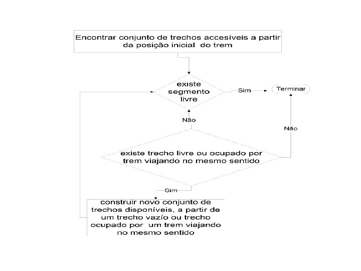 Algoritmo para encontrar Segmento Livre 1. Seja (Y’, Z’) a posição inicial do trem TREM: (Y’, Z’); Y’, Z’ V 2. Construir o conjunto de caminhos a serem analisados: CP = {i | i = (Z’, I), I V and i P(G) } 3. Verificar o seguinte: 3. 1 Se num(CP) = 0 então um segmento livre foi encontrado; terminar. 3. 2. Se [ i, j | w(i) = 1 e w(j) = 0, i, j CP] então um segmento livre foi encontrado; terminar. 3. 3. Se [ i, j | w(i) = 0 e w(j) = 0, i, j CP ] então um segmento livre foi encontrado; terminar. 3. 4 Se [ i | w(i) = 0 ou w(i) = 1, i CP ] então: 3. 4. 1 Seja Z tal que i CP com i = (J, Z) e w(i) {0, 1} 3. 4. 2 Construir um novo conjunto de caminhos a serem analisados: CP = {i | i = (Z, I), i P(G) and I V } 3. 4. 3. continuar (ir a 3. ) 3. 5. Caso contrário um segmento livre não foi encontrado; terminar