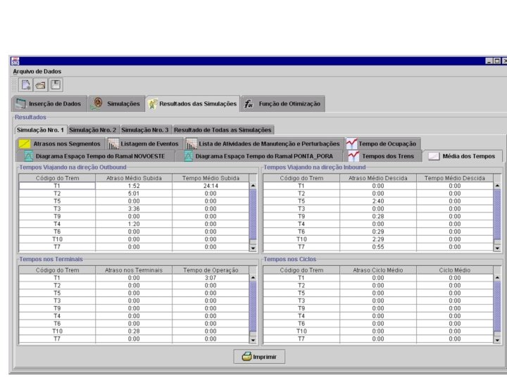 D. Modelos de Trens • Características comuns dos trens • Descrito por: comprimento, vagões, locomotivas e tempos de percurso nos segmentos. • Dependência entre trens: fator de ajuste, modelo de trem do qual depende E. Trens Despachados • • Modelo de percurso Modelo de escalas: inbound e outbound Modelo de trem: inbound e outbound Horário de partida, desvio, sentido de viagem. • Dependência entre trens: intervalo de tempo após o qual parte, trem do qual depende.
