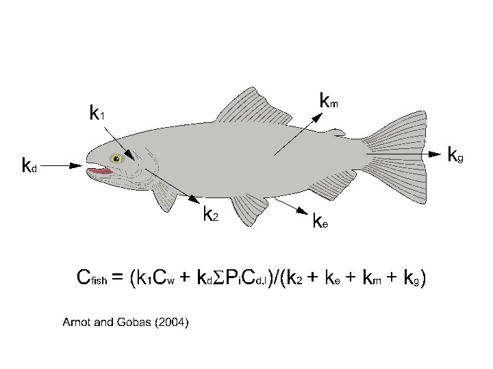 Characterize in vitro metabolism under linear conditions (Vmax = 1000 pmoles/min/mg protein, Km = 100 pmoles/µl) 1 Calculate CLin vitro, int from the ratio Vmax/Km (10 µl/min/mg microsomal protein) 2 Apply extrapolation factors to calculate CLin vivo, int (6500 µl/min/kg fish, or 9. 36 L/d/kg fish) 3 Apply well-stirred liver model to calculate CLh (1. 79 L/d/kg fish) 4 Calculate whole-fish metabolism rate constant kb (0. 035/d; corresponding to a metabolism t ½ of 19. 8 days) 5 Combine with estimates of ku and knb to simulate Cfish and predict the BAF