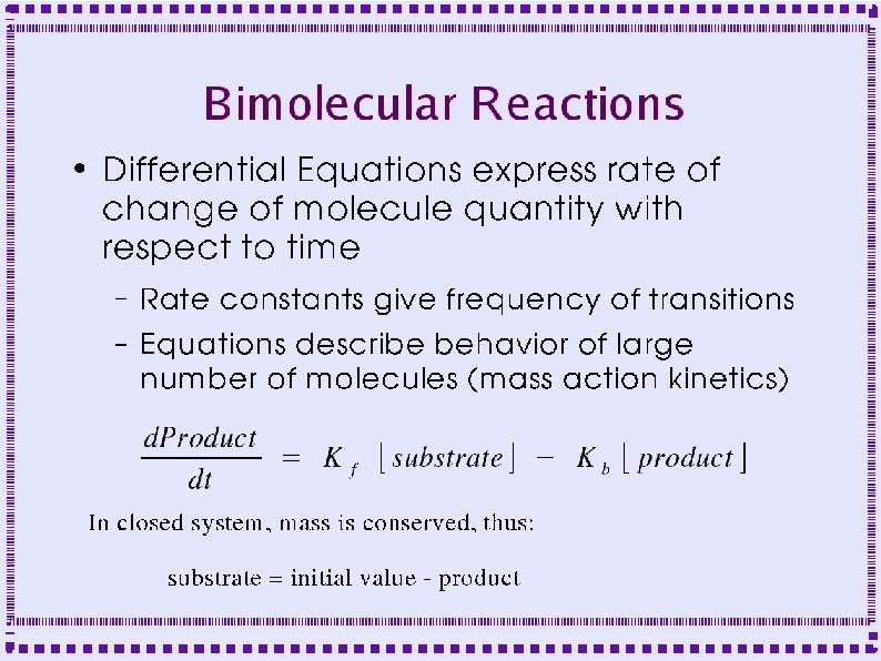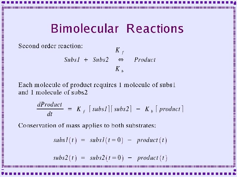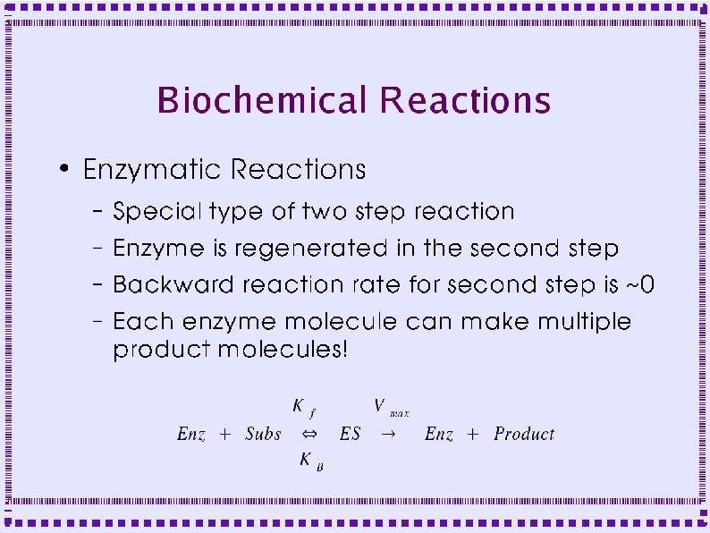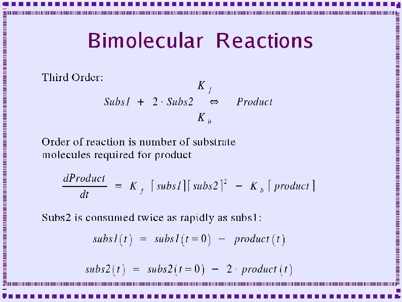 Biochemical Reactions ● Bimolecular Reactions – Stoichiometric interactions between substrate molecules to form product molecule ● ● ● Formation of bond between the substrate molecules Stoichiometric implies that the reaction specifies the number of each molecule required for reaction Molecules are consumed in order to make product