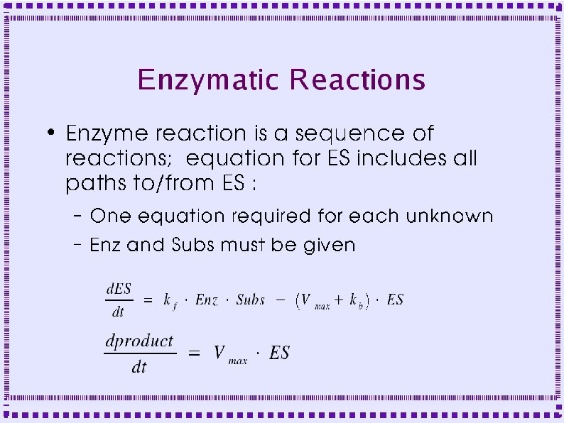 GENESIS objects ● Calculate changes due to reactions – – Enzyme (Chemesis) ● Fields: Kcat, Kf, Kb ● Inputs: enzyme, substrate quantity ● Calculates amount of Enzyme-Substrate complex ● Calculates change in product, enzyme, substrate Enz (kinetikit) ● Fields: Kcat, Kf, Kb ● Inputs: enzyme, substrate quantity ● Can implement stochastic reactions