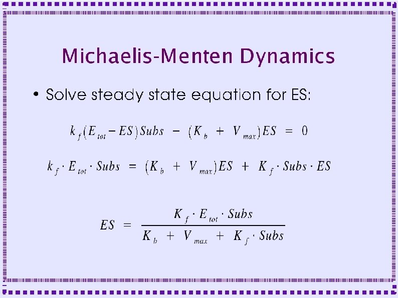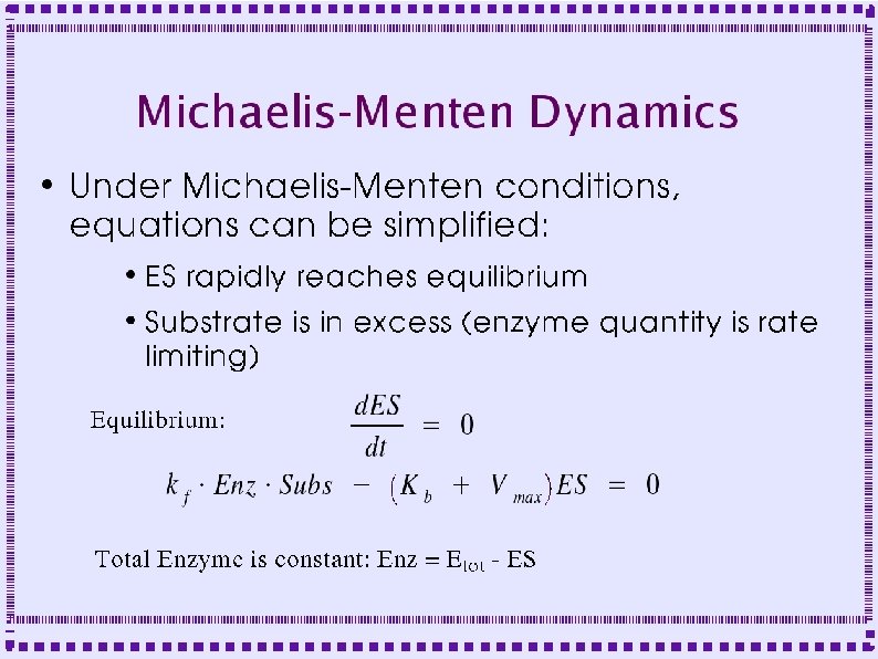 GENESIS objects ● Calculate changes due to reactions – mmenz (Chemesis) ● Use if MM assumptions are met ● Fields: Km and Vmax ● Inputs: Enzyme, substrate concentration ● Calculates Vmax times [Enzyme] times substrate ● Empirical feedback modification of enzyme activity can be added.