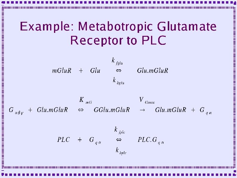When to Model Biochemical Reactions ● Metabotropic Receptors – Protein does not form channel – Protein is linked to GTP binding protein – Effect mediated by ● Activated G protein subunits ● Down stream second messengers