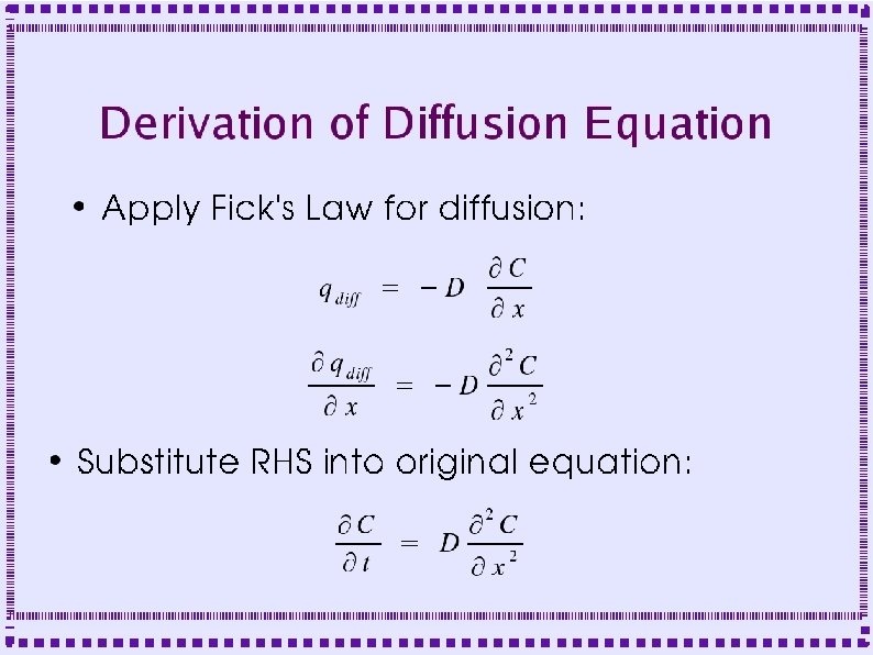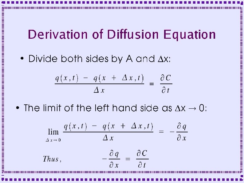 Derivation of Diffusion Equation ● Flux into left side of slice is q(x, t) ● Flux out of right side is q(x+Dx, t) – ● Fluxes may be negative if flow is in direction opposite to arrows Area for diffusional flux is A