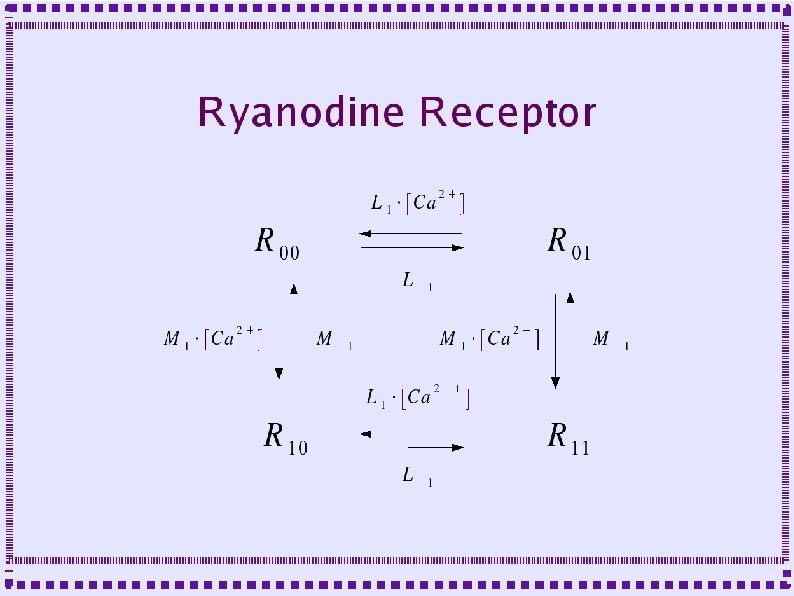 Calcium Release ● Receptors are modeled as multi-state molecules – One state is the conducting state – For IP 3 Receptor state transitions depend on calcium concentration and IP 3 concentration – For Ryanodine Receptor, state transitions depend on calcium concentration