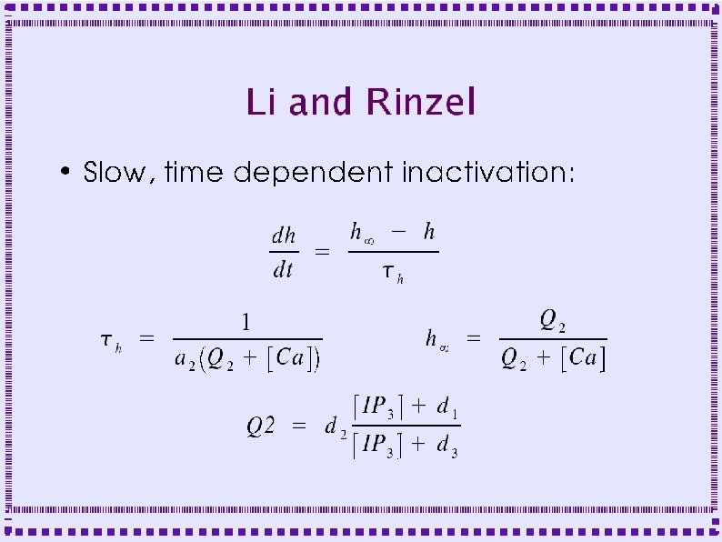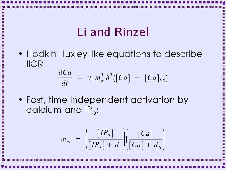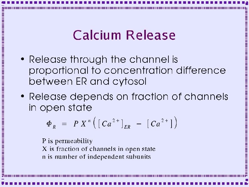 Dynamics of Release Channels ● ● Both IP 3 R and Ry. R have two calcium binding sites: – Binding to one site is fast, causes fast channel opening – Binding to other site is slower, causes slow channel closing IP 3 R has an additional binding site for IP 3