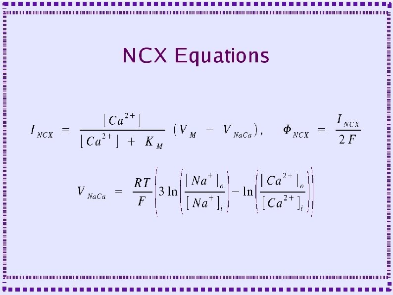 Sodium Calcium Exchange (NCX) ● Stoichiometry – ● ● 3 (maybe 4) sodium exchanged for 1 calcium Charge transfer – Unequal => electrogenic – One proton flows in for each transport cycle – Small current produces small depolarization Theoretical capacity ~50 x greater than PMCA