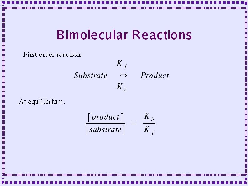 Biochemical Reactions ● Bimolecular Reactions – Reaction order is the number of simultaneously interacting molecules ● ● ● First order reaction: single substrate becomes product Rate constants: rate (units of per sec) at which substrate becomes product Ratio of rate constants gives concentration of substrates and products at equilibrium