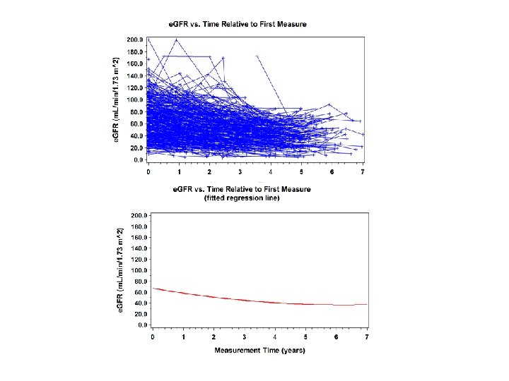Example: Annual Assessment of Renal Function in Hypertensive Patients typical for some time points to be missed UNITNO YEAR AGE SCr 000 -79 -25 0 75. 8 1. 0 77. 3 1. 62 000 -79 -25 1 76. 9 1. 1 69. 0 1. 62 000 -79 -25 2 . . . 000 -79 -25 3 78. 3 1. 0 76. 8 1. 62 000 -79 -25 4 79. 4 1. 4 51. 9 1. 62 001 -00 -05 0 83. 4 1. 4 38. 1 1. 20 001 -00 -05 1 84. 0 1. 6 32. 6 1. 20 001 -00 -05 2 85. 4 2. 1 23. 8 1. 20 001 -00 -05 3 86. 4 1. 8 28. 3 1. 20 001 -00 -05 4 87. 4 1. 3 41. 1 1. 20 . EGFR PSV responses for each subject are vectors