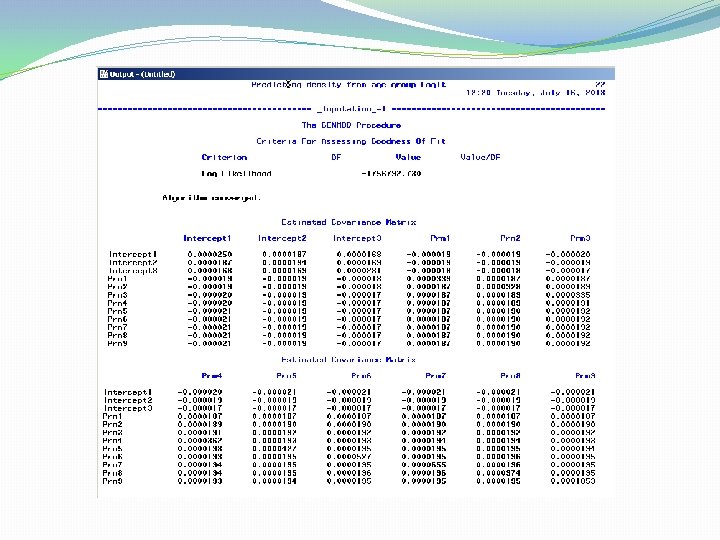 Logistic Ordinal Regression /*Running logit ordinal regression for age*/ proc genmod data=BCSC. current rorder=internal; freq N; model density_c = age 47 age 52 age 57 age 62 age 67 age 72 age 77 age 82 age 87 / Cov. B dist=multinomial link=cumlogit type 1; by _Imputation_; ods output Cov. B = BCSC. age. Cov. B; ods output Parameter. Estimates = BCSC. age. PE; title 'Predicting density from age group Logit'; format density_c dense. ; run;