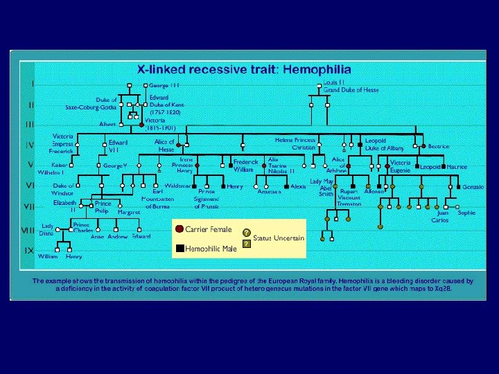 Principali malattie recessive legate all’X MALATTIA Frequenza per 10. 000 maschi Daltonismo 800 Ritardo mentale X fragile 5 Distrofia muscolare di Duchenne 3 Emofilia A (difetto di coagulazione da deficit di fattore VIII) 2 Emofilia B (difetto di coagulazione da deficit di fattore IX) 0. 3