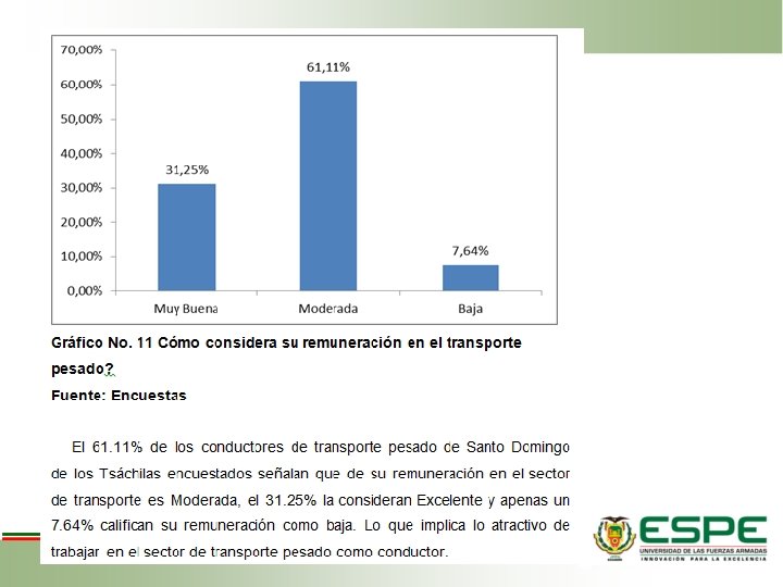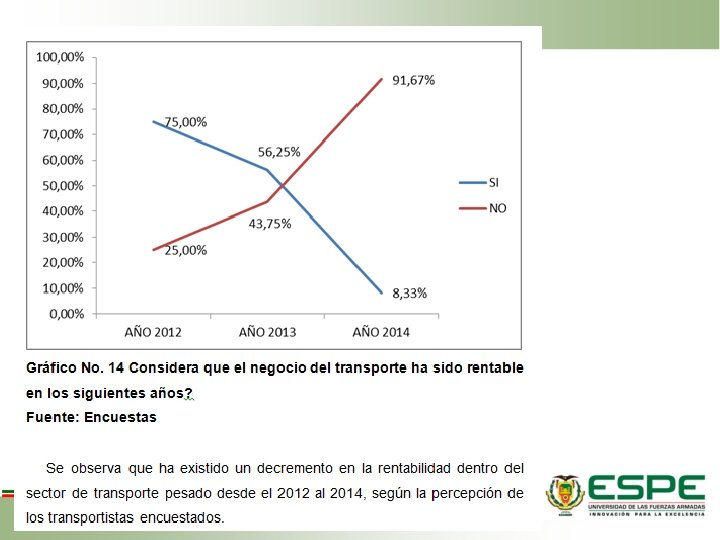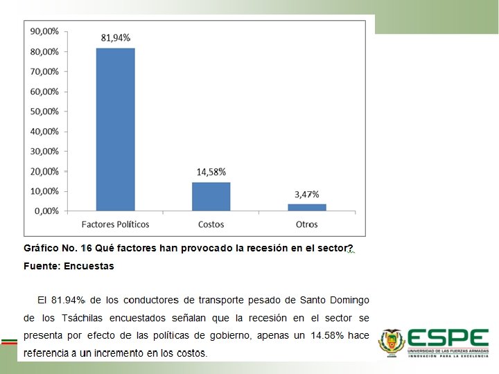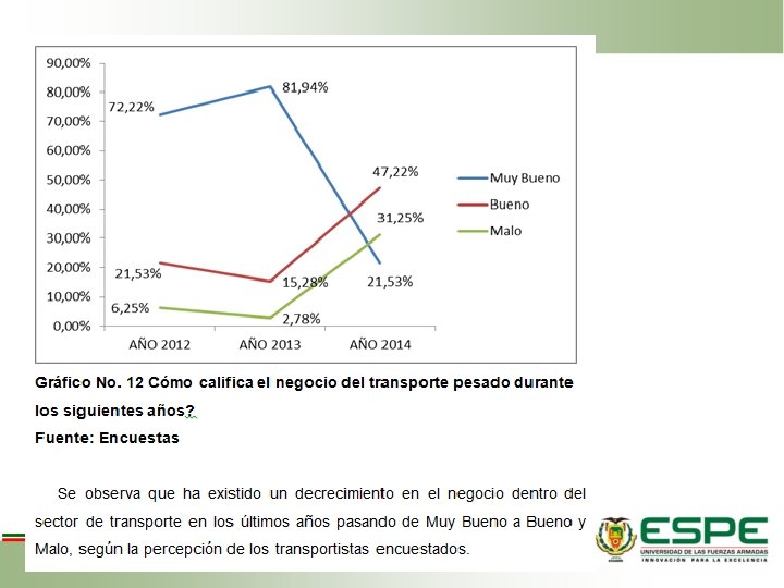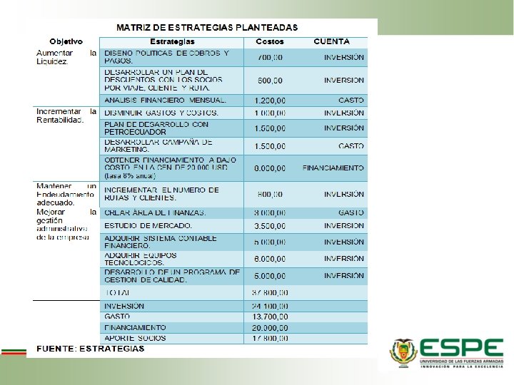 FODA • • • • • DEBILIDADES Falta de planes estratégicos. Falta de análisis financiero. Falta de elaboración de presupuestos. No se dispone de manuales de procesos y de funciones. Falta de tecnificación administrativa. Falta de control interno. Carencia de indicadores de gestión. AMENAZAS Recesión económica del País. (baja del PIB). Cambios constantes en leyes tributarias. Falta de crédito para el sector de transporte pesado. Aumento de precios de combustibles. Falta de apoyo del gobierno al sector comercial e industrial. Incremento de la inflación. Aumento del Riesgo país. Baja de los precios del petróleo a nivel mundial. Excesivos impuestos. Restricción a las importaciones.