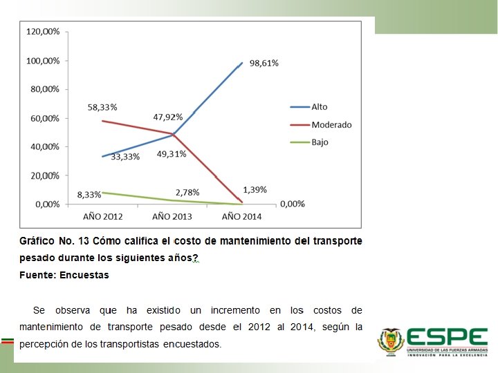 Del 100% de los activos la principal carga se halla en los activos corrientes en los años 2012 y 2013, pero al año 2014 está disminuye siendo de un 48. 20% ya que asume la carga los activos no corrientes por la adquisición de vehículos que comprende el 51. 31%. Por el lado de pasivos y patrimonio, la estructura se halla concentrada en el patrimonio durante los años 2012 y 2014, en el año 2013 la mayor participación la presentaron los pasivos con un 52. 40%.