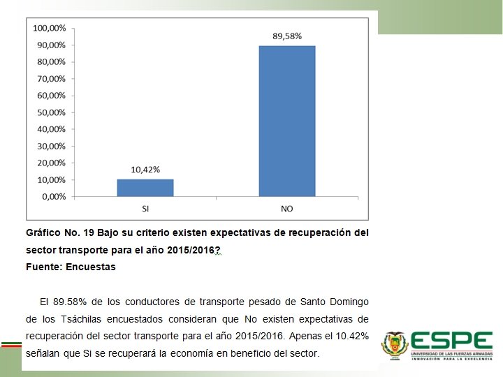 Conclusiones • El diagnóstico situacional y financiero de la empresa y el análisis de sus fortalezas, debilidades, amenazas y oportunidades, determinan que la empresa no tiene una buena estructura financiera, particularmente de liquidez y rentabilidad así como una débil gestión administrativa financiera. • La situación económica del Ecuador afectada por la coyuntura internacional que se presenta por la baja de los precios del petróleo, esta entrando en una etapa de recesión y eso afecta a todo el sector industrial y en especial al sector de transporte del país. • Con el diseño de estrategias financieras y administrativas se pueden mejorar los niveles de equilibrio en liquidez, rentabilidad, actividad y deuda de la empresa CORDOLEC.
