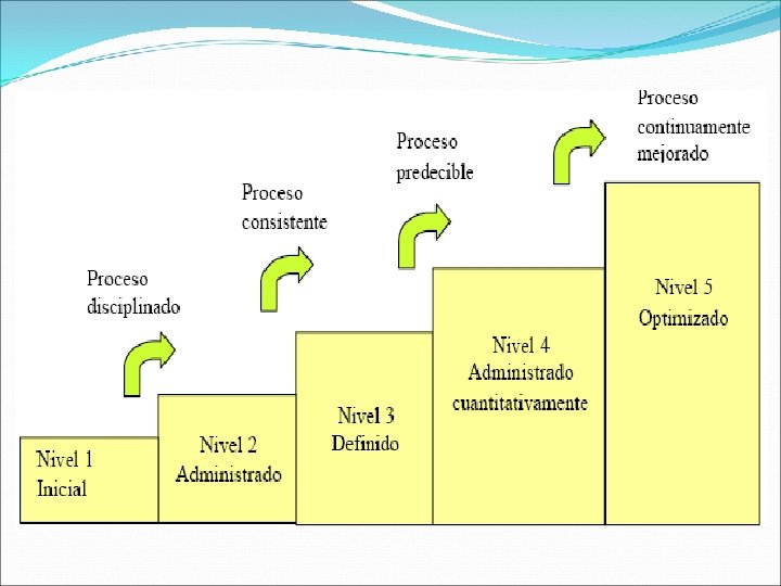 Optimizado Los procesos de la organización son mejorados continuamente basados en una comprensión cuantitativa de las causas comunes de variación inherentes a los procesos. El nivel 5 está centrado en mejorar continuamente el desempeño de los procesos con mejoras tecnológicas incrementales e innovadoras.