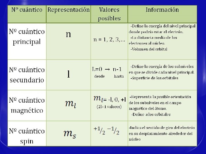 Valores de los números cuánticos - n = 1, 2, 3…n - l = 0, 1, 2, 3… (n-1) - m = toma valores desde –l, … 0…+l - s = +1/2 y -1/2